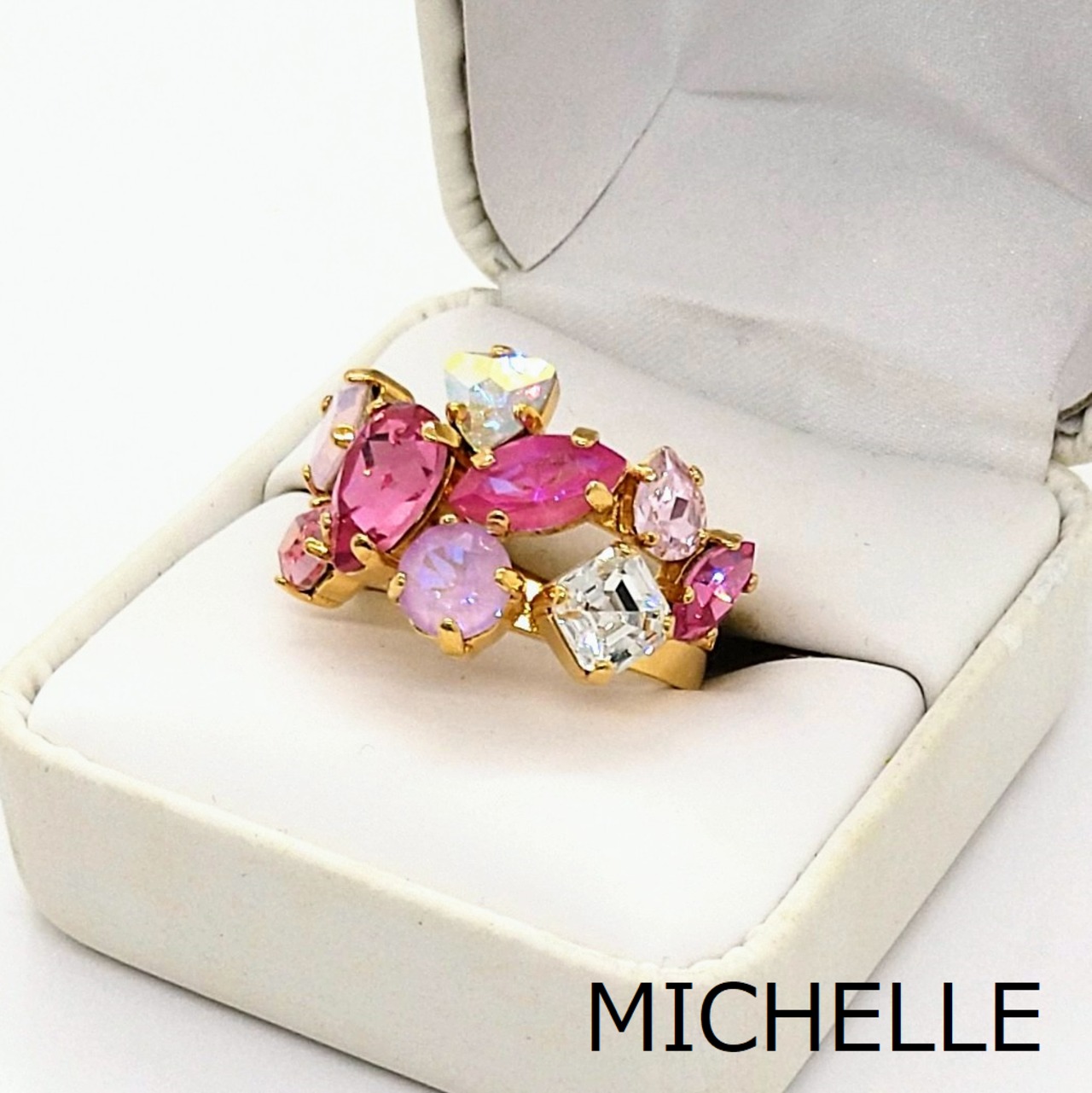 上品で優しいピンク系のクリスタルを集めて、華やかな大振りリングを作りました。